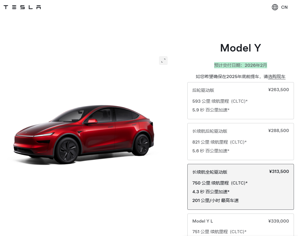 也就是说,现在下订 Model Y 最早也要等到 2026 年 1 月份才能提到车,而全/后驱长续航版 2 款车型最早则要到 2 月才能交付。