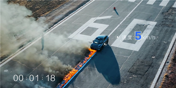 第二项测试凶险非常,需要将整辆车开到一条长长的“火路”上,车辆以5km/h的速度前进,由炙热的明火直接烧烤电池包长达1分多钟。