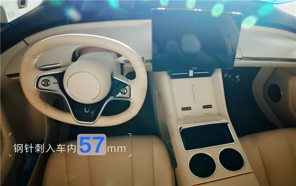 而此次更是在户外进行,风速5级,增大了穿刺后的失火风险,直径6mm的钢针刺入车体57mm后诱发电芯内反应,穿刺口出现了冒烟。