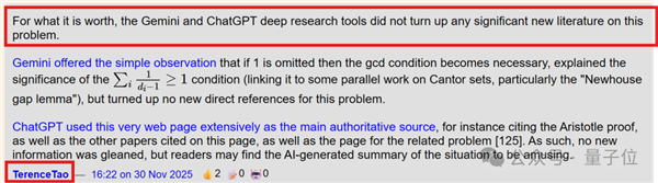 甚至连陶哲轩这样的顶尖数学家也跑来围观讨论,他在对比了Gemini和ChatGPT的深度研究工具后发现,Harmonic模型对该问题的证明表现更佳。