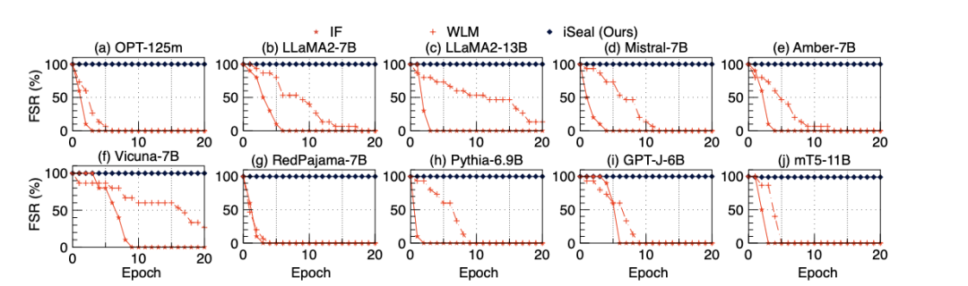 传统指纹方法在经过少量微调后即完全失效(FSR ≈ 0%)。 这是因为 iSeal 的指纹互不纠缠,使得攻击者无法通过遗忘部分指纹来破坏整个验证结构。