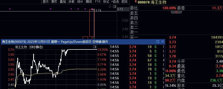 海王这个平开涨停,下午也反复几次涨停了,看1点35分封住涨停没打开,其实1点41分的分时明细是有打开涨停的,拿鼠标对准1点41分的涨停位置,点键盘的回车键,就能看到右边的分时明细成交了,如果开盘入的后盘浮盈10%如果涨停入的次日也有点套利空间,所以心态好的如何避免错过也可以开盘附近入些底仓不高,这样符合条件再加仓补,但是不同位置要求不同,此方法只合适高开不多或是平开和低开的去做,高开很多的不合适此方法,一旦无法涨停,狗庄就会开盘直线绿盘或是跌停来杀人诛心,所以不同位置和开盘的细节要求不同