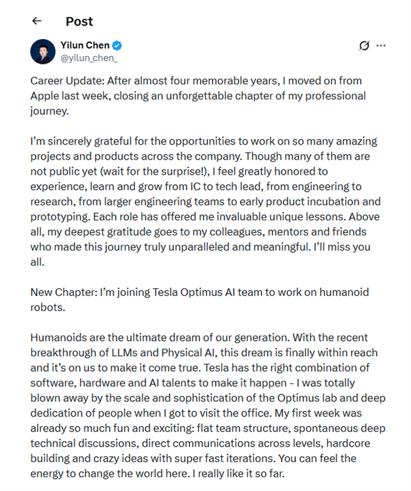 这位名为Yilun Chen的前苹果技术负责人在社交媒体上透露,他选择加入特斯拉主要是因为Optimus项目的规模与技术层次,以及团队展现出的高度专注与专业精神,让人感到震撼。
