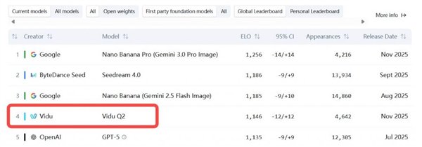 值得一提的是,在最新的 AA 榜单中,Vidu 首次发布的图像编辑功能首次参与即位列第四,超越 OpenAI,并且可以跟 Google、Bytedance 大厂比肩。