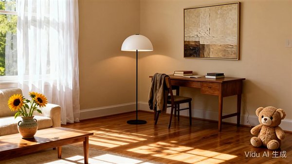 从生成的结果来看,Vidu Q2 参考生图不仅保持了落地灯、挂画和毛绒玩具的原貌,也精准地放置到了我们预期的位置;而且也会按照符合物理规律地来调整角度和灯光等细节。