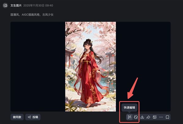 例如先用文生图功能生成一张 9:16 的国漫风少女,在输出结果的下方会有一个" 快速编辑 "的按钮: