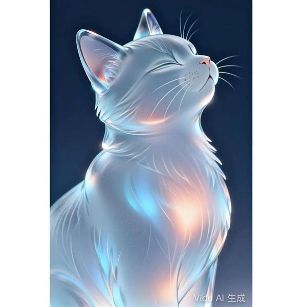 极简内发光插画,磨砂玻璃材质,一只猫的侧脸仰望,闭眼安静温柔,身体如透明雕塑般从内部透出光晕,淡淡蓝色与橙红色渐变交织,内部暖光柔和流动,画面空灵,深蓝或者黑色背景。