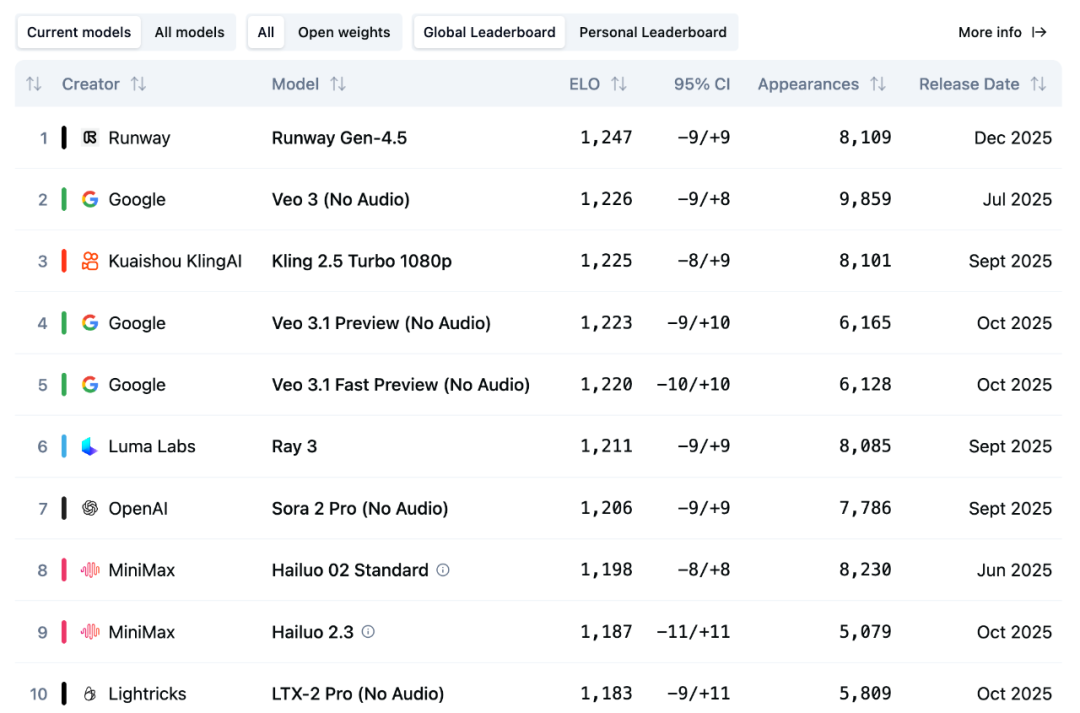 Artificial Analysis 最新视频榜单前十名分别如下: