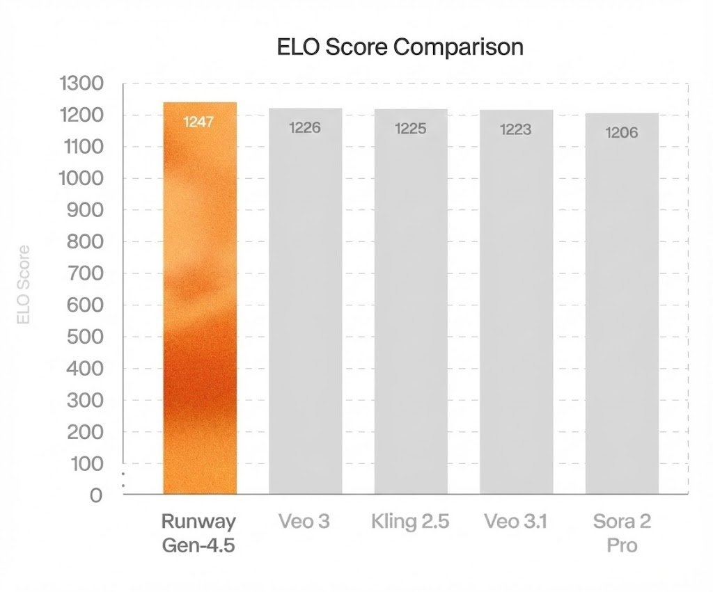 另外,作为目前全球评价最高的视频生成模型,Runway Gen-4.5 的 ELO Score 分数超越了 Veo 3/3.1、Kling 2.5 和 Sora 2 Pro,具备前所未有的视觉逼真度与创意控制能力。