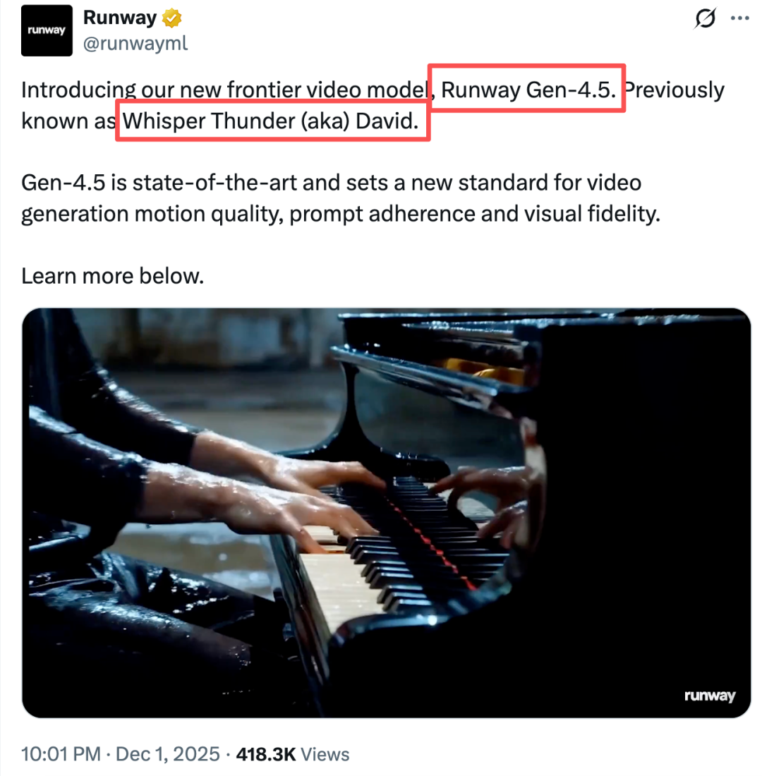 终于,几天前登上 Artificial Analysis 榜首的神秘模型 Whisper Thunder (aka) David 现出了真身。