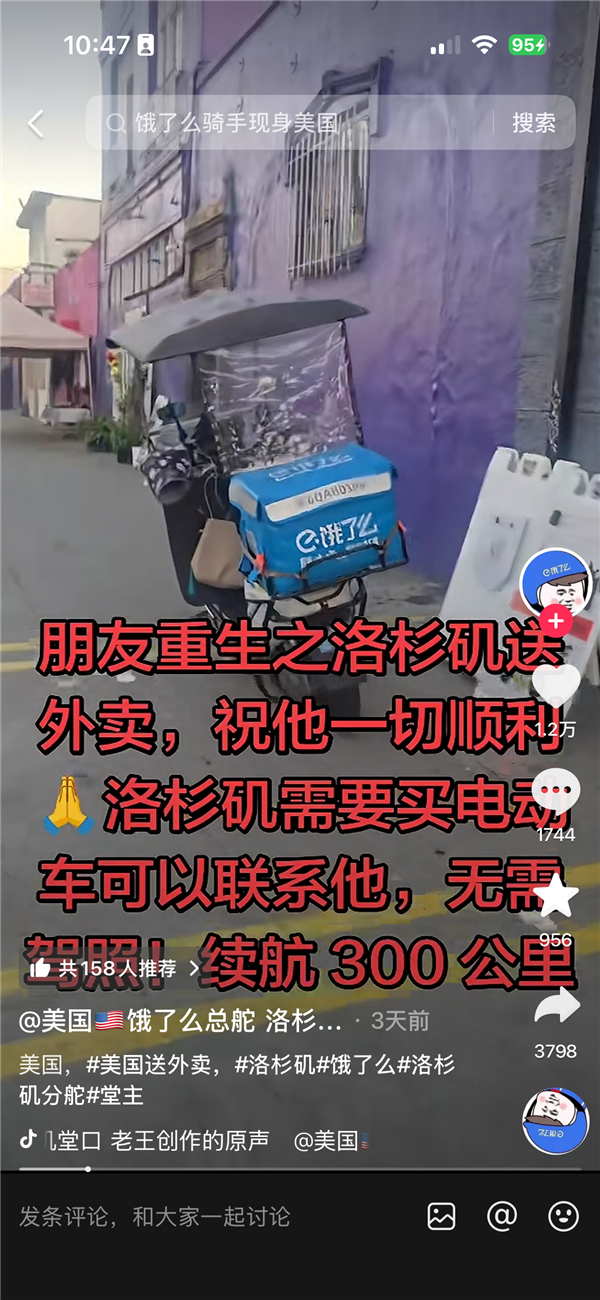 这位骑手此前在国内饿了么平台从事外卖配送工作,后来出于各种原因,他将自己的装备,包括电动车和饿了么外卖箱,通过海运邮寄到了洛杉矶。