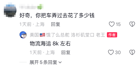 针对这一疑问,骑手在评论区回应道,通过物流海运的方式,花费了8000元左右。