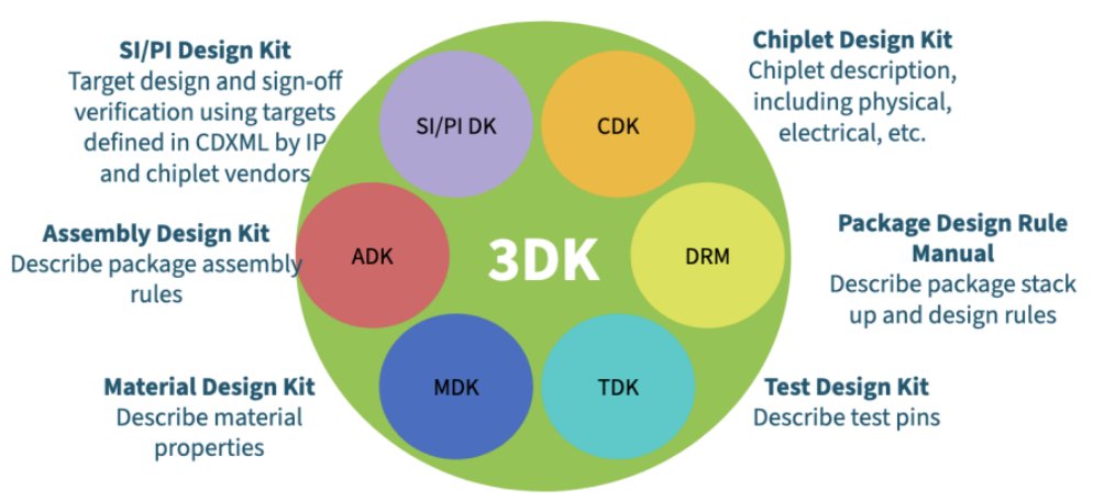 的引入 为了简化多芯片封装流程,OCP和JEDEC发布了装配设计套件(ADK)、测试设计套件(TDK)、材料设计套件(MDK)、封装设计规则手册(DRM)以及电气授权,形成了一个称为3DK的交叉协作结构(见图1)。[1,2,3,4]