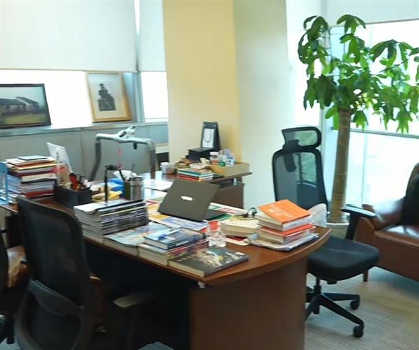 视频中,俞敏洪的办公室也第一次向媒体开放,房间不大,但堆满了各种各样的书。