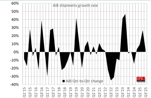 12月2日消息,根据Jon Peddie Research发布的2025年第三季度AIB(独立显卡)市场份额报告,NVIDIA仍占据绝对主导地位,但AMD和Intel在本季度均实现了份额增长。