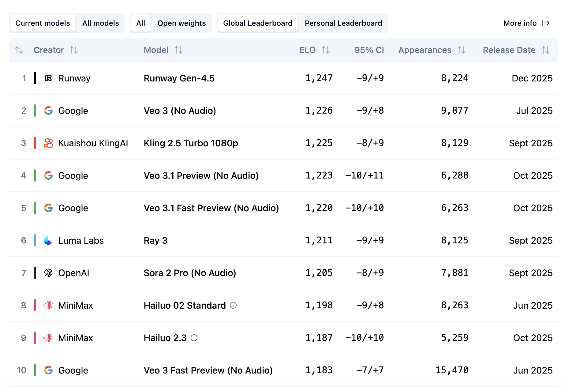 根据Artificial Analysis的榜单,目前Gen-4.5以1247的评分拿下文生视频的第一名,紧随其后的是谷歌的Veo3,分数为1226,9月发布的快手可灵2.5排在第三位,分数为1225,与谷歌Veo3仅一分之差。OpenAI的Sora2 pro排在第7位,MiniMax的海螺02排在第8位。