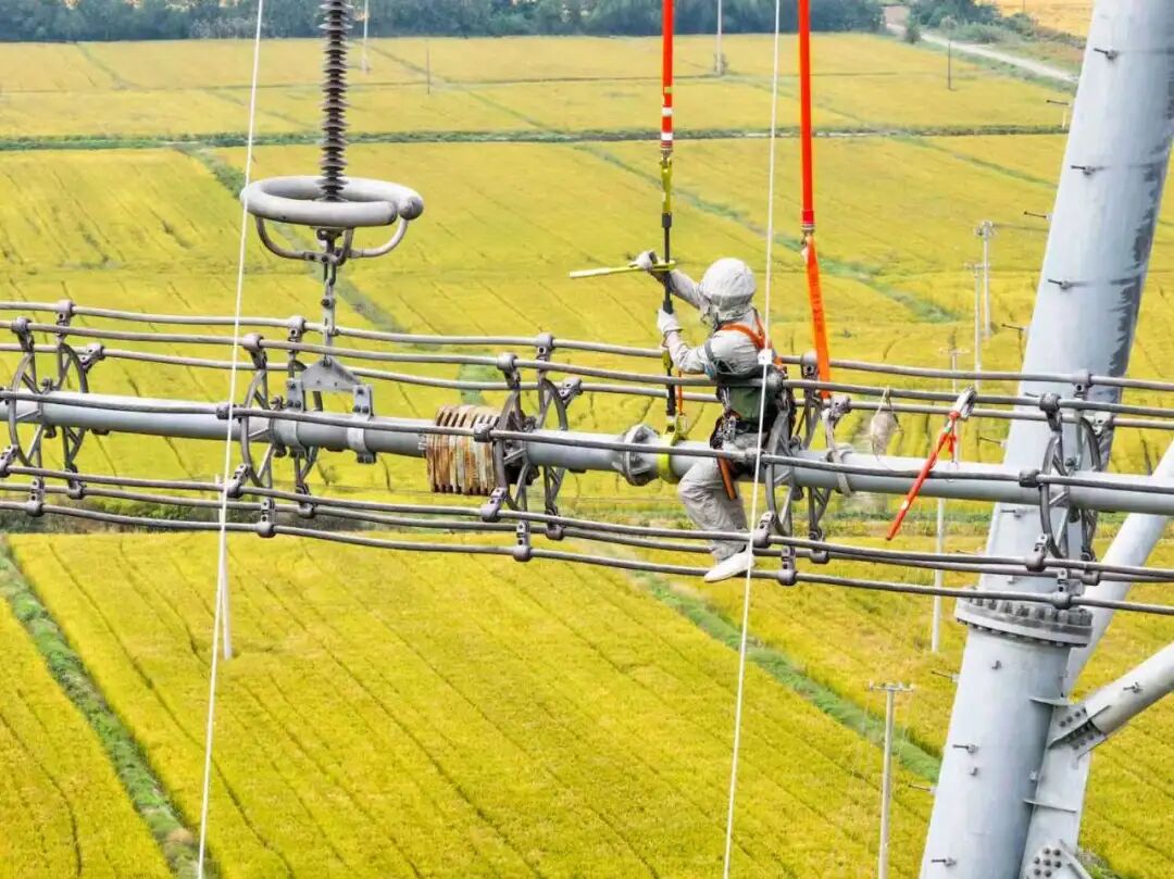 国网江苏超高压公司利用无人机+电动升降机等设备,对1000千伏淮南-南京-上海特高压交流输变电工程盱泰线进行维护。图片来源:国网江苏省电力有限公司