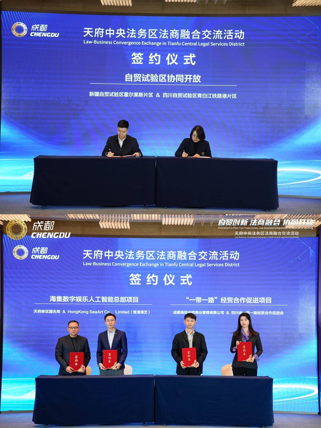 现场,聚焦自贸试验区协同开放,新疆霍尔果斯自贸区与青白江铁路港片区签订开放合作协议;天府新区国合局与HongKong SeaArt co., Limited(香港海艺)就海集数字娱乐人工智能总部项目签订合作协议;成都高投中欧商业管理有限公司与四川省一带一路经贸合作促进会签订“一带一路”经贸合作促进项目的合作协议。