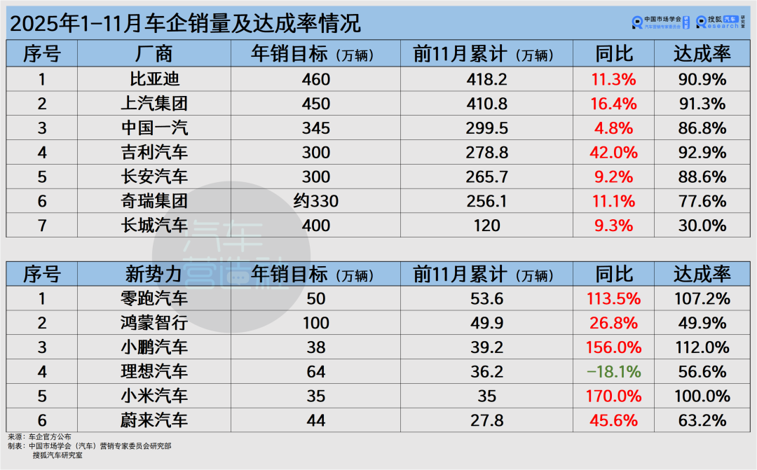 距离2025年“交卷”还剩1个月,又到了车企们汇报年销目标达成率的关键节点:截止2025年11月,新势力中零跑、小鹏、小米都已提前锁定年度销量目标;比亚迪、上汽以及吉利的年销目标达成率也来到90%以上。