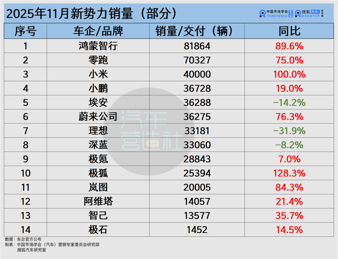 对比各家新势力的11月销量,鸿蒙智行、零跑、小米、蔚来公司、极狐、岚图等企业表现抢眼,同比增长均在70%以上。