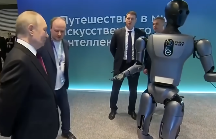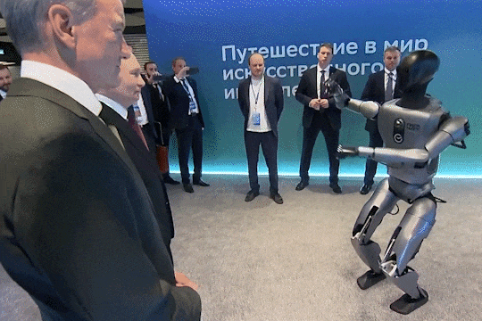 或许是觉得爱豆太丢人,翻车事故几天之后,俄罗斯媒体集体报道了另一款机器人,试图找回场子。这款名叫“格林”的产品,属于官方背景的俄联邦储蓄银行,被派去在“人工智能之旅”国际会议上展览,当普京到访会场,格林还为他献上了表演。