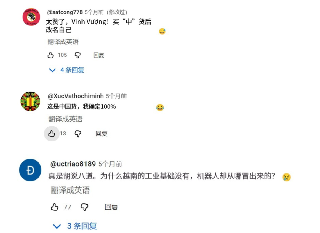 可问题在于,越南网友自己都不相信所谓的“纯国产”,越南造个手机、造个摩托车,都需要从中国进口零部件过来组装,这样的国家,怎么可能能一步登天造出机器人?网友直接疯狂嘲讽Vingroup,是不是从亚马逊中国买了机器人然后印了自己的logo?又想搞噱头拉股价?