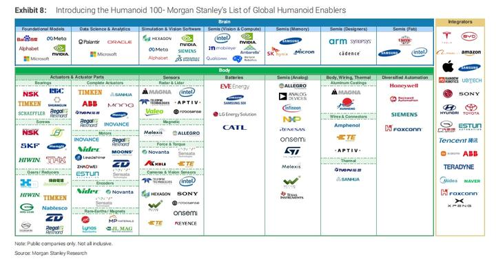 根据摩根士丹利今年发布的人形机器人研报,人形机器人价值链的TOP100企业,中国企业占到了37家(含中国台湾),美国占到了35家,日、韩占18家,而欧洲、中东总共12家,就更别说其它国家了。