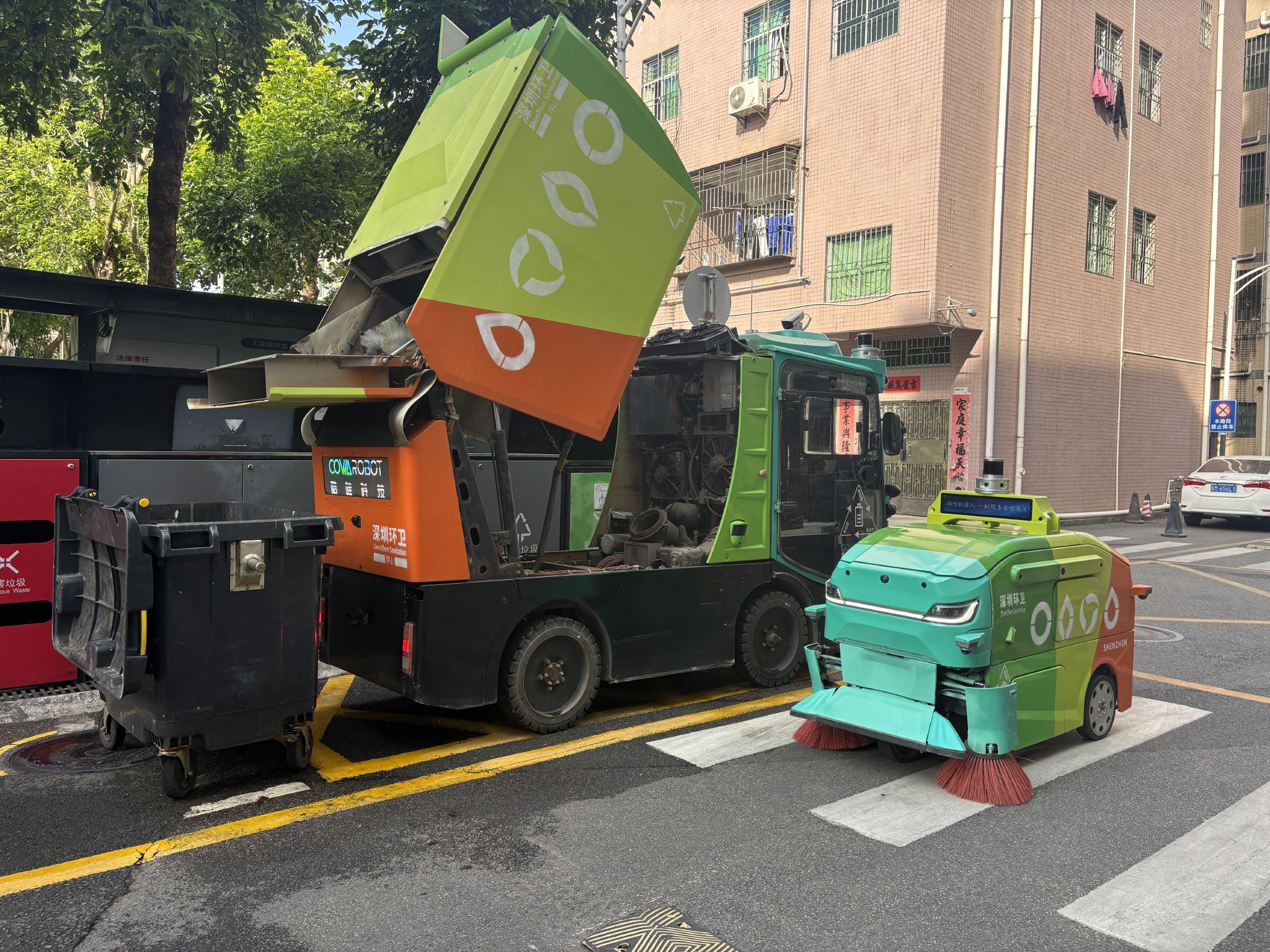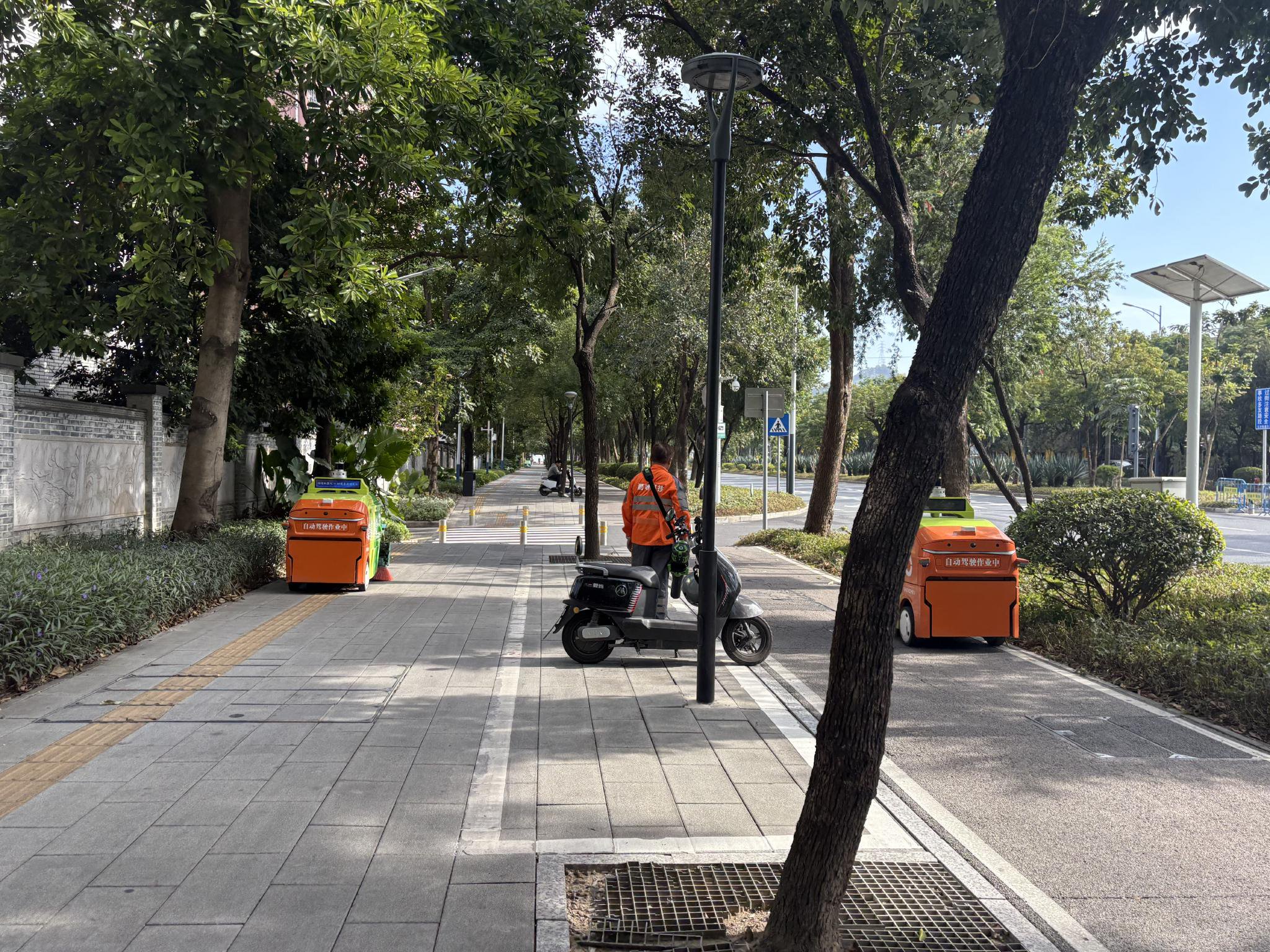 在深圳石井街道的人行道上,停着两辆刚刚结束作业的四轮环卫机器人。