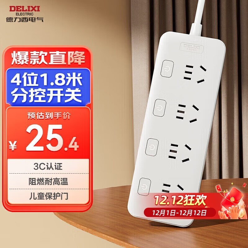 德力西J - E4K4X/B插线板促销,到手仅27.4元!