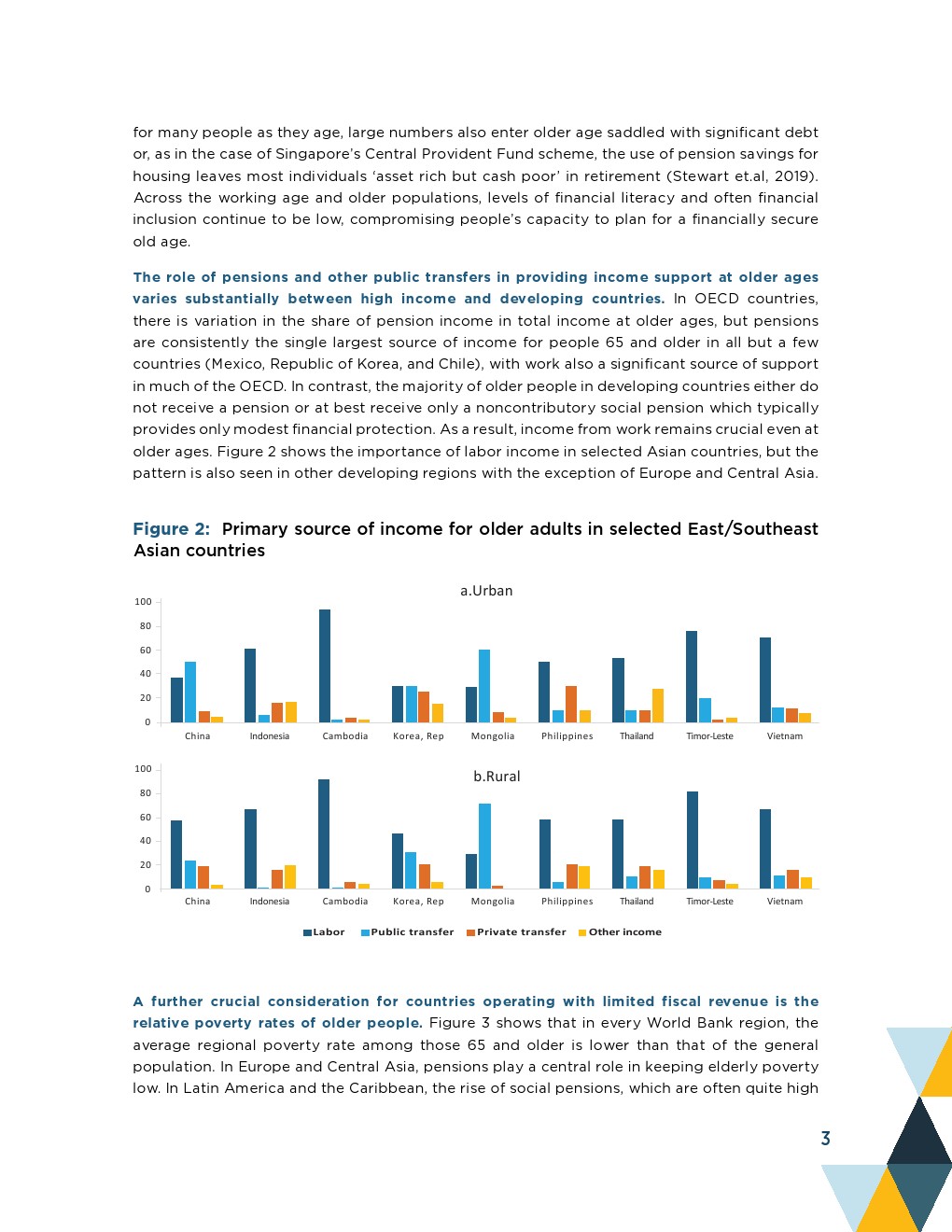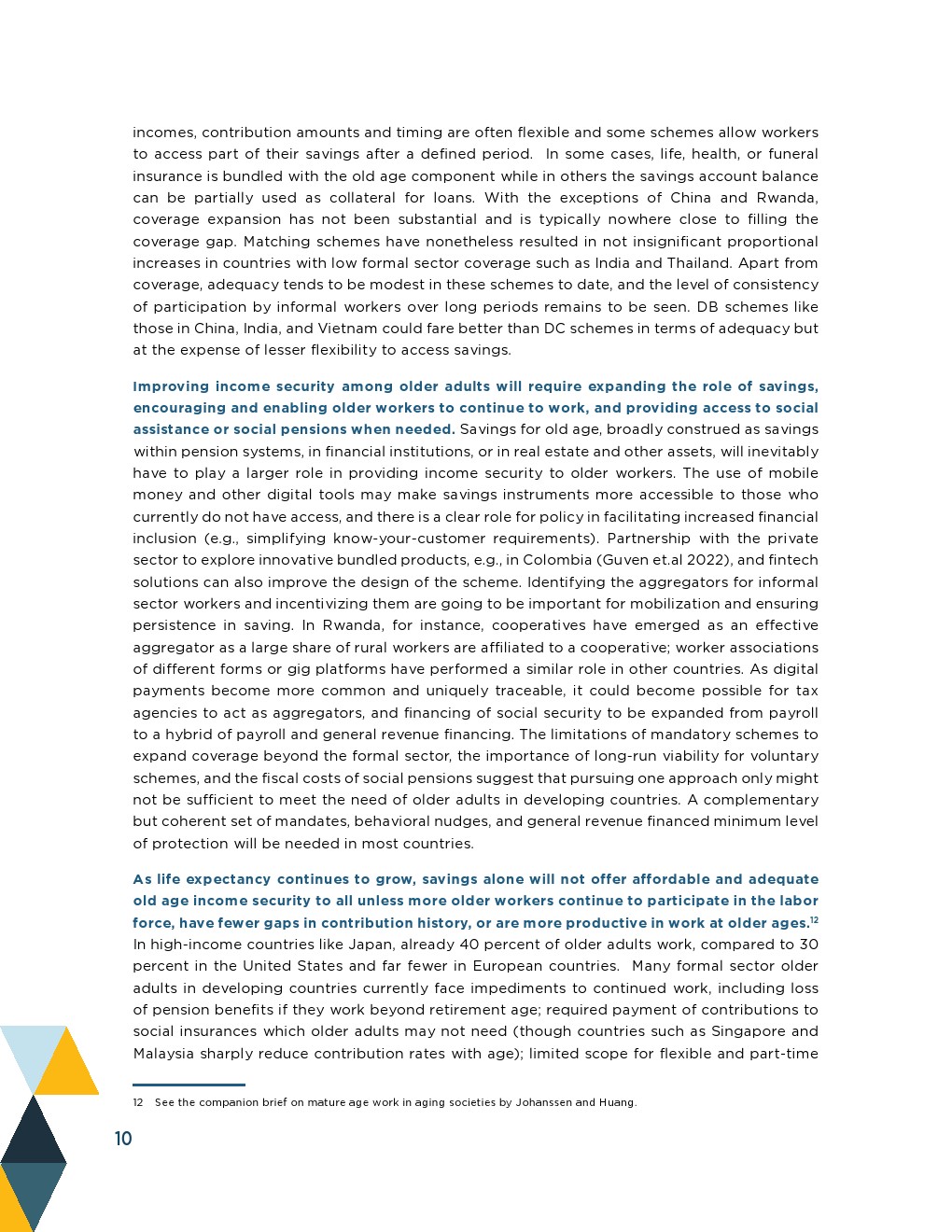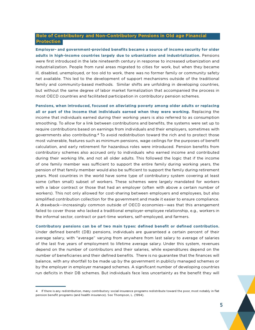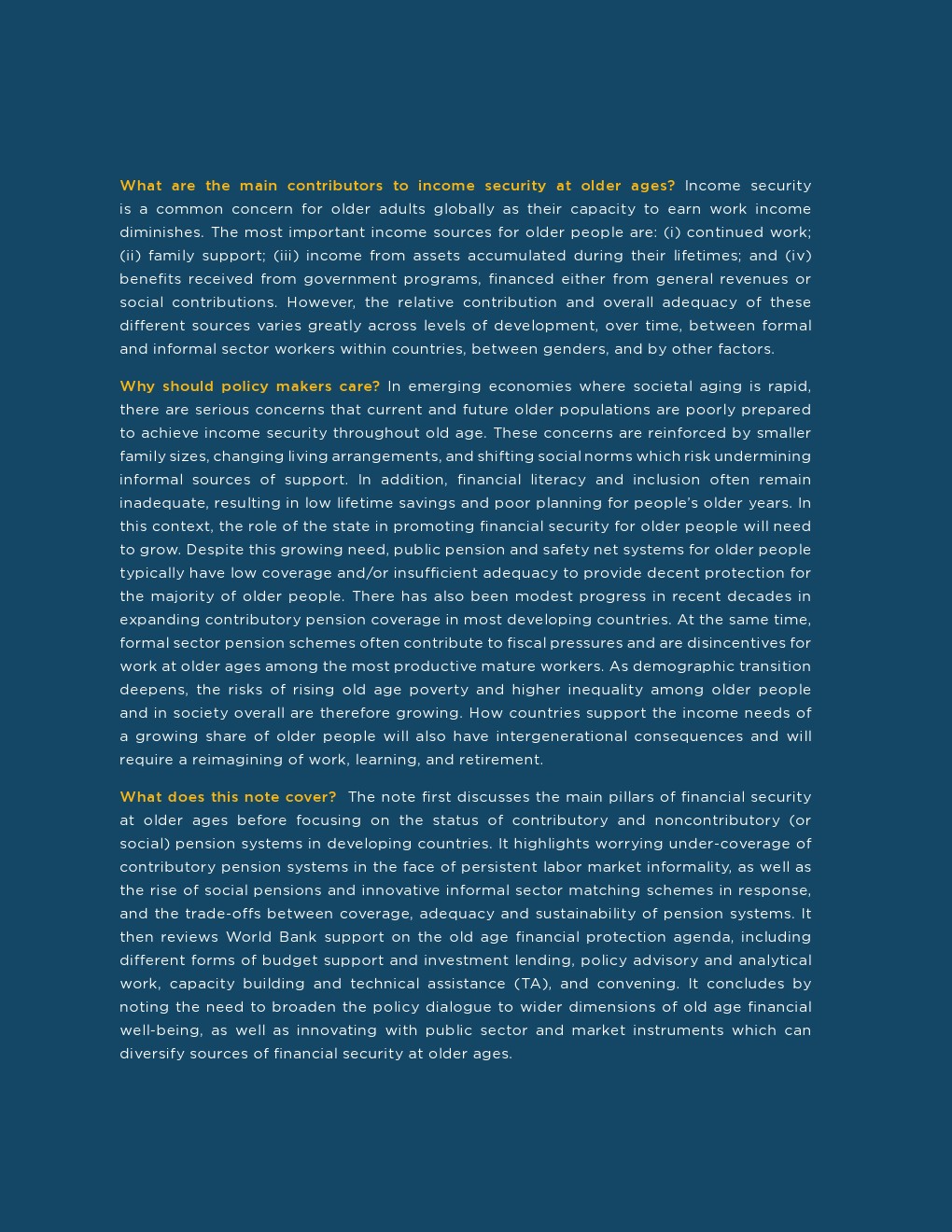 直到20世纪,来自家庭的支持、持续的工作以及来自物质和金融资产的收入一直是富裕国家老年人收入保障的普遍来源,在世界大部分地区仍然占主导地位。