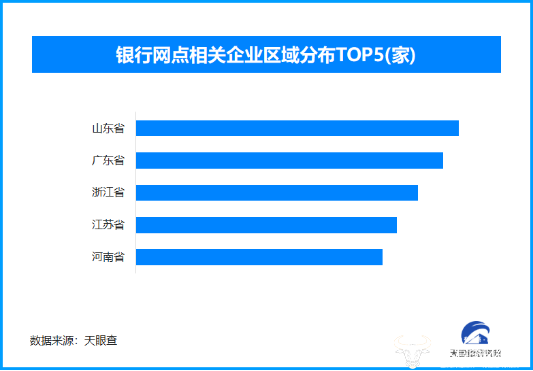 天眼查专业版数据显示,截至目前我国现存在业、存续状态的银行网点相关企业超17.3万家。从区域分布来看,山东省、广东省、浙江省银行网点相关企业数量位居前列,分别为超1.3万余家、1.2万余家和1.1万余家。