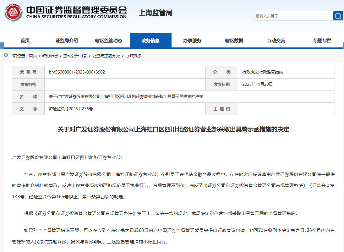 11月20日,上海证监局披露对广发证券股份有限公司上海虹口区四川北路证券营业部采取出具警示函措施的决定(沪证监决〔2025〕236号)。