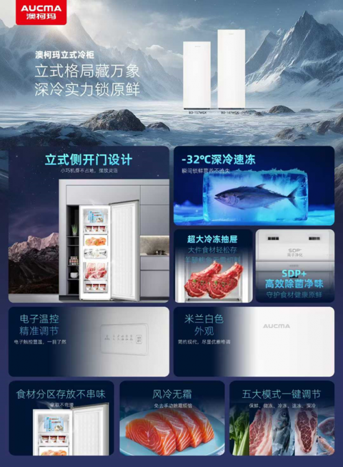 保鲜技术方面,两款冷柜均搭载 澳柯玛-32 摄氏度深冷速冻技术,能快速锁定食材水分与营养,减少细胞破损,最大程度保留食材原鲜口感与营养成分。同时采用风冷无霜技术,无需手动除霜,既避免了霜层占用储物空间,又减少了清洁麻烦,让使用更省心。配合SDP + 离子净化系统,冷柜可高效除菌、净化异味,从源头守护食材健康,让每一口食材都新鲜安心。