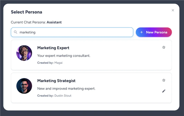 Dustin 凭借多年的营销背景,发现许多用户并不知道如何编写高质量的提示词(Prompt)。为了降低使用门槛,Magai 引入了“Persona”(人格)系统。
