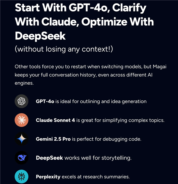 在当下的多模型竞速时代,Magai 代表的是一种越来越清晰的趋势:把 GPT、Claude、Gemini、LLaMA、DeepSeek 等模型统一收纳到一个工作台里,让用户不再需要在多个网站、多个账号之间来回切换。
