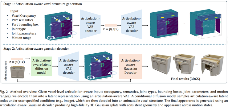 方法的核心在于把几何结构、运动机制和外观纹理放在统一框架中进行学习。结构化潜空间同时表达几何、语义与关节信息,扩散模型进一步学习它们之间的关联,外观微调机制保证物体在发生运动后仍然呈现自然、稳定的纹理。通过这种整体式的建模方式,生成结果避免了传统流程中结构和外观不协调的问题,看起来更加一致和可信。
