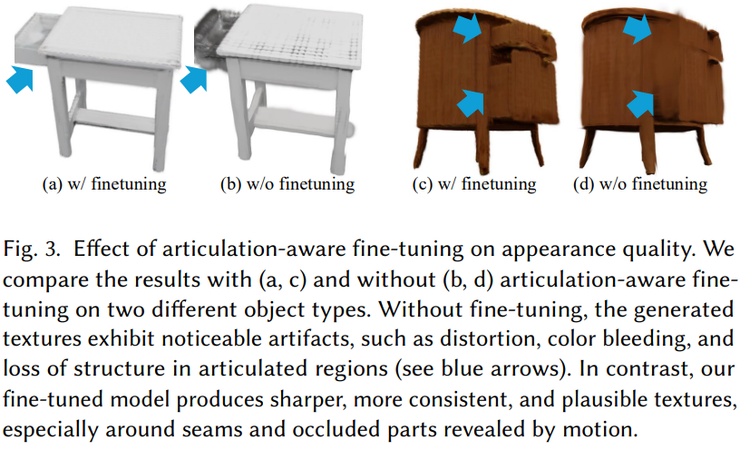 最后,消融实验也强调了关节感知外观微调策略的重要性。如果不使用该策略,生成结果在关节处和运动后暴露出的内部区域容易出现噪点、模糊或颜色异常。而加入该策略后,纹理清晰度及稳定性显著提升,新暴露区域的外观也更加自然一致,从而证明这一模块是整体性能提升的关键因素。