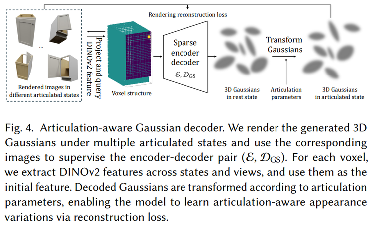 在结构生成能力具备之后,论文最后解决的是外观生成的问题。由于原始的三维高斯解码器只在静态物体上训练,它无法处理关节运动带来的可见性变化,因此在运动后暴露出的内部区域容易出现纹理缺失或异常。