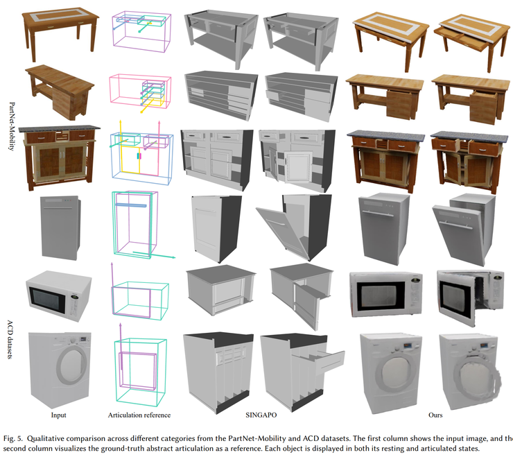 在应用层面,这种能够从单图生成可动三维物体的能力具有很大的价值。虚拟现实和增强现实场景可以快速获得可交互物体,线上家具展示能够更容易地呈现开合、旋转等动作,游戏制作也能受益于自动生成带关节的三维模型。对于机器人学习而言,这类可动生成物体有助于机器人理解和预判未知物体的使用方式,也适用于家庭和工业场景的数字孪生构建。几乎所有需要大量可交互三维对象的行业都可能因此受益。