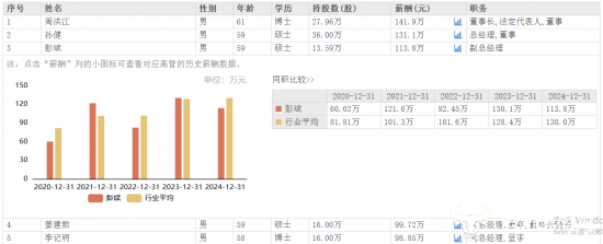 可以看出,彭斌科班出身,且已在张裕工作了多年,积累了丰富的经验。而彭斌2024年薪酬为113.8万元,相较于2023年的130.1万元,下降了16.3万元,但是三位副总经理中唯一一个去年薪酬超过百万的,其他两位副总姜建勋、李记明去年薪酬分别为99.72万元、98.85万元,均低于彭斌。