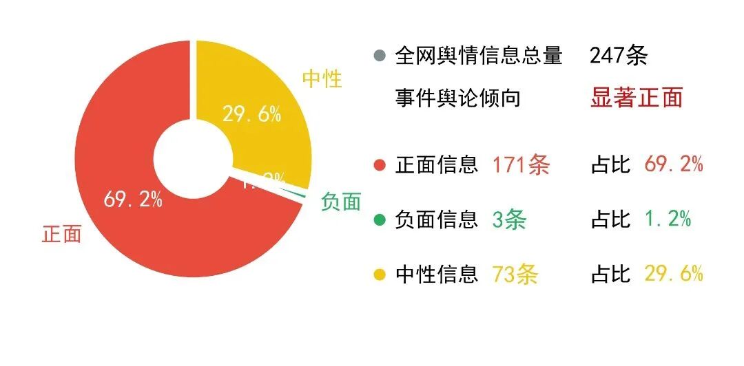 截至12月4日,此事件匹配的到全网舆情信息总量为247条,正面信息171条,占比69.2%,负面信息3条,占比1.2%,中性信息73条,占比29.6%,事件舆论呈现出较为正向的倾向。