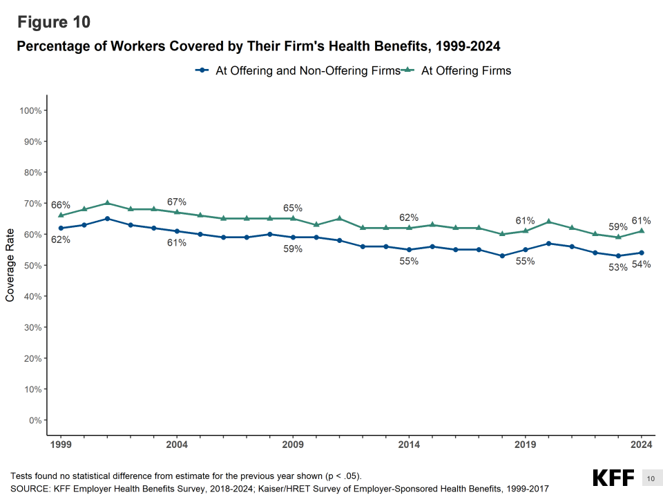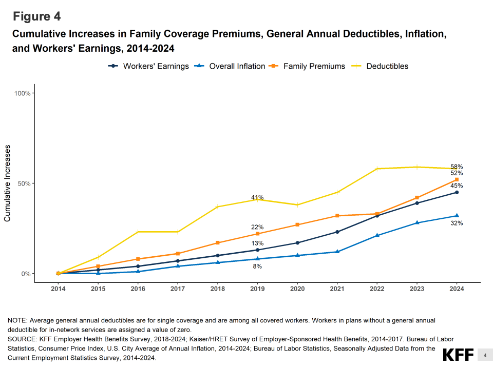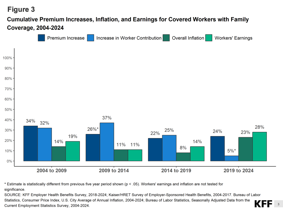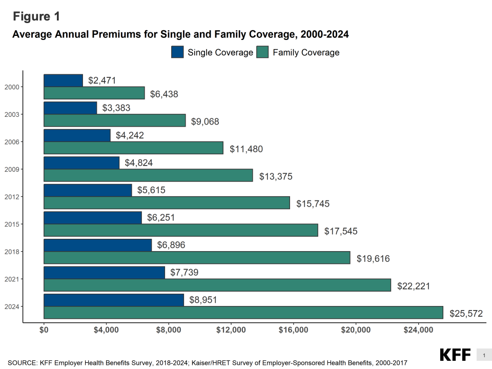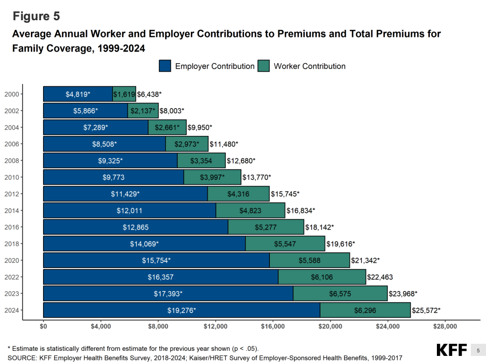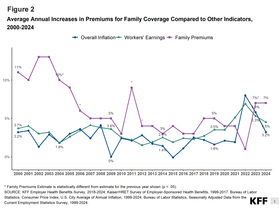 数据显示,2024年雇主为员工提供的年度单人健康保险平均保费达到8830美元,比2023年增长7%,为过去十年来最大涨幅之一。家庭保费更高,达到约24,500美元,雇主承担近70%,员工平均自付7,750美元。相比十年前,员工自付部分已上升近50%,反映出医疗通胀与工资增长的持续脱节。