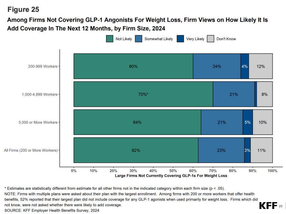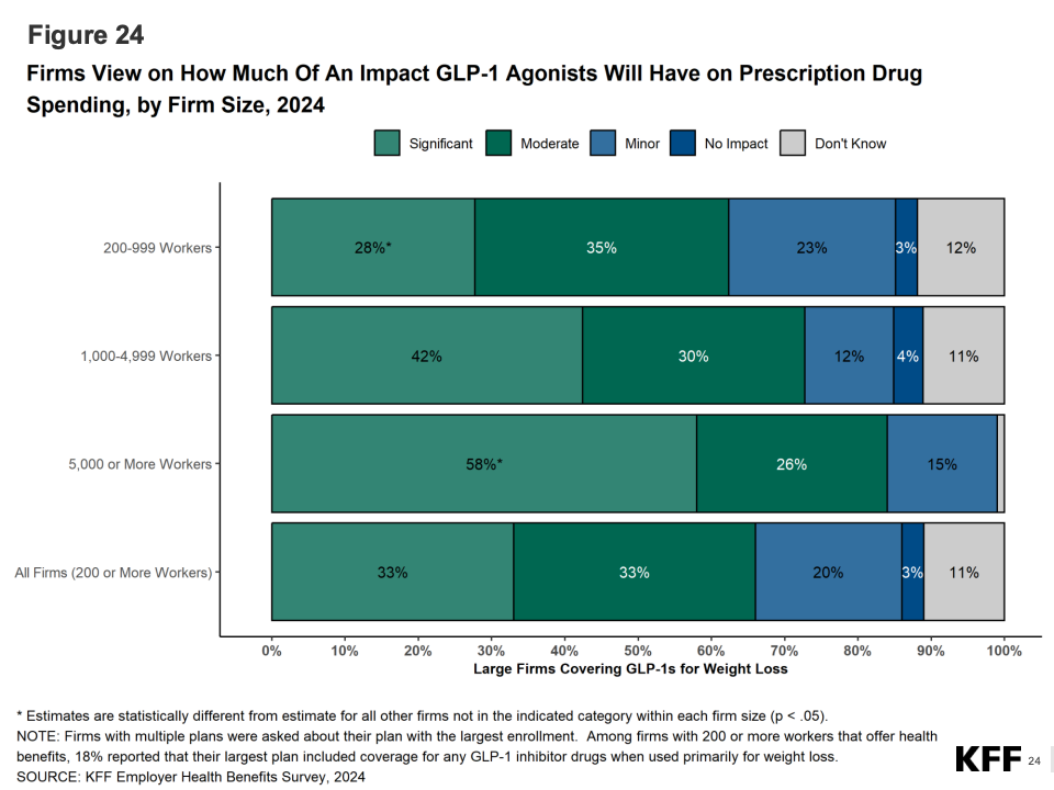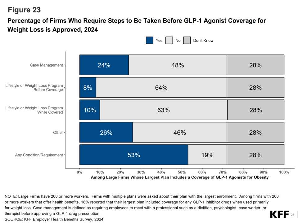 药品成本成为2024年的新焦点。KFF指出,处方药支出增速达9%,GLP-1类减重药(如Ozempic、Wegovy)推动了支出上升。超过25%的大型雇主表示在审查或限制此类药物的保险覆盖;约10%的公司已实施费用上限或使用管理措施。这标志着雇主健康策略从“全覆盖”转向“精细管理”。