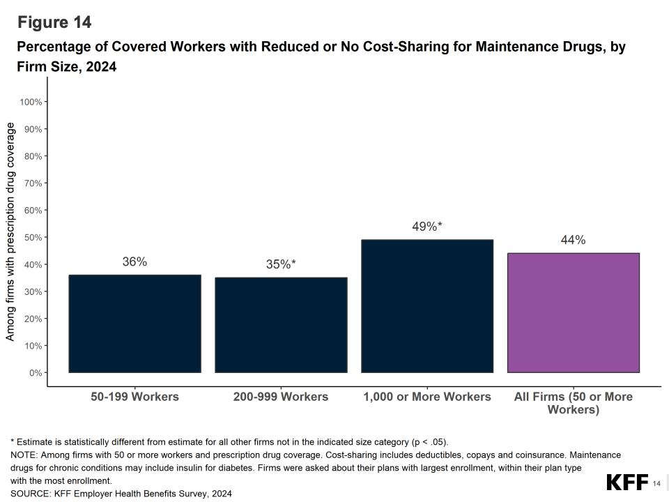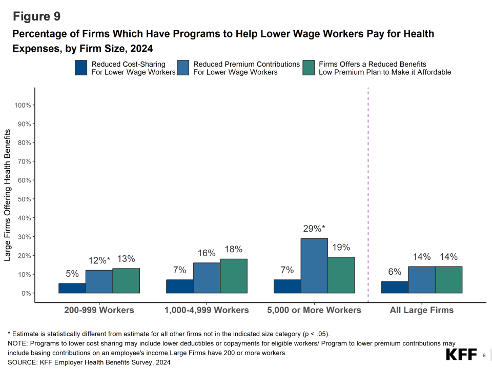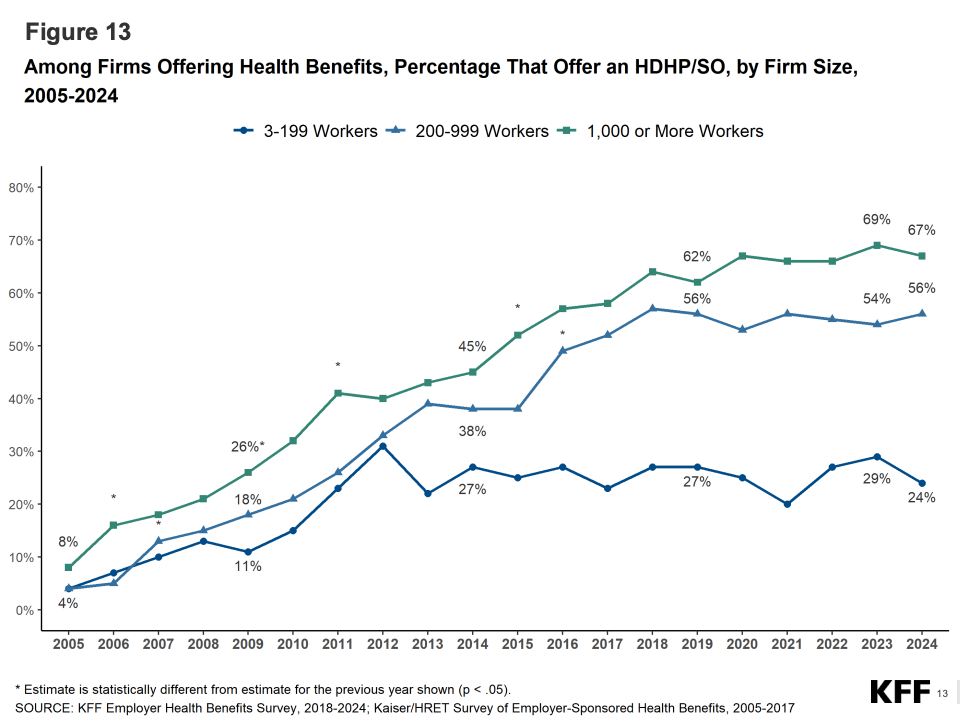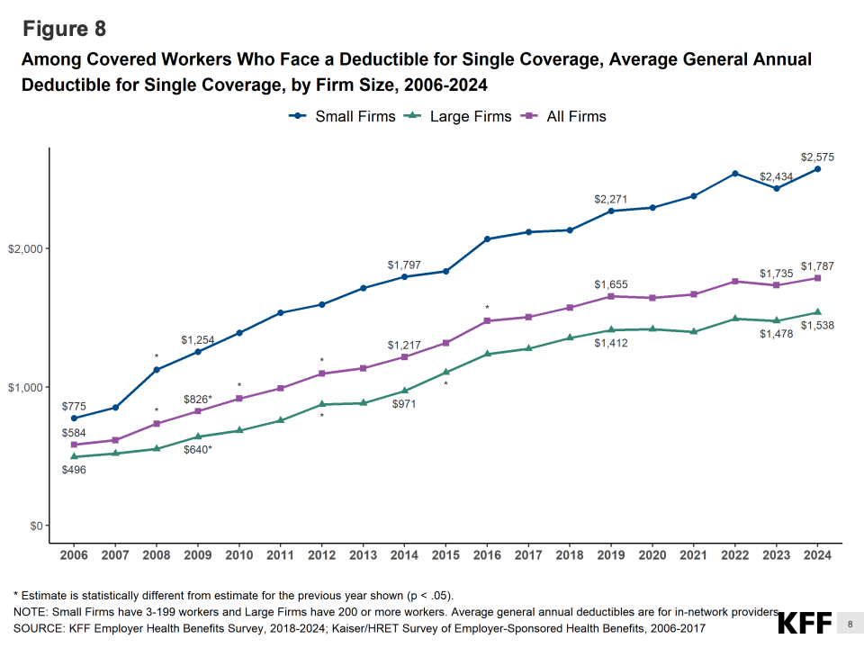 在自付结构方面,员工平均年度免赔额为1,735美元,较去年略升2%。中小型企业的员工负担更重,小企业免赔额中位数接近2,300美元,而大型企业约为1,200美元。报告指出,这种差异反映了规模经济在医疗谈判中的作用,也折射出低收入劳动者健康保障的不平等现象。