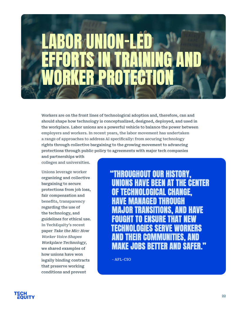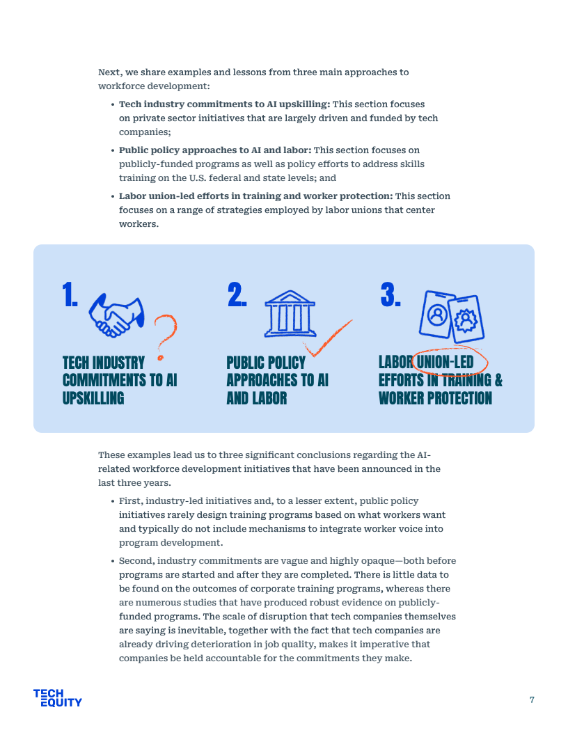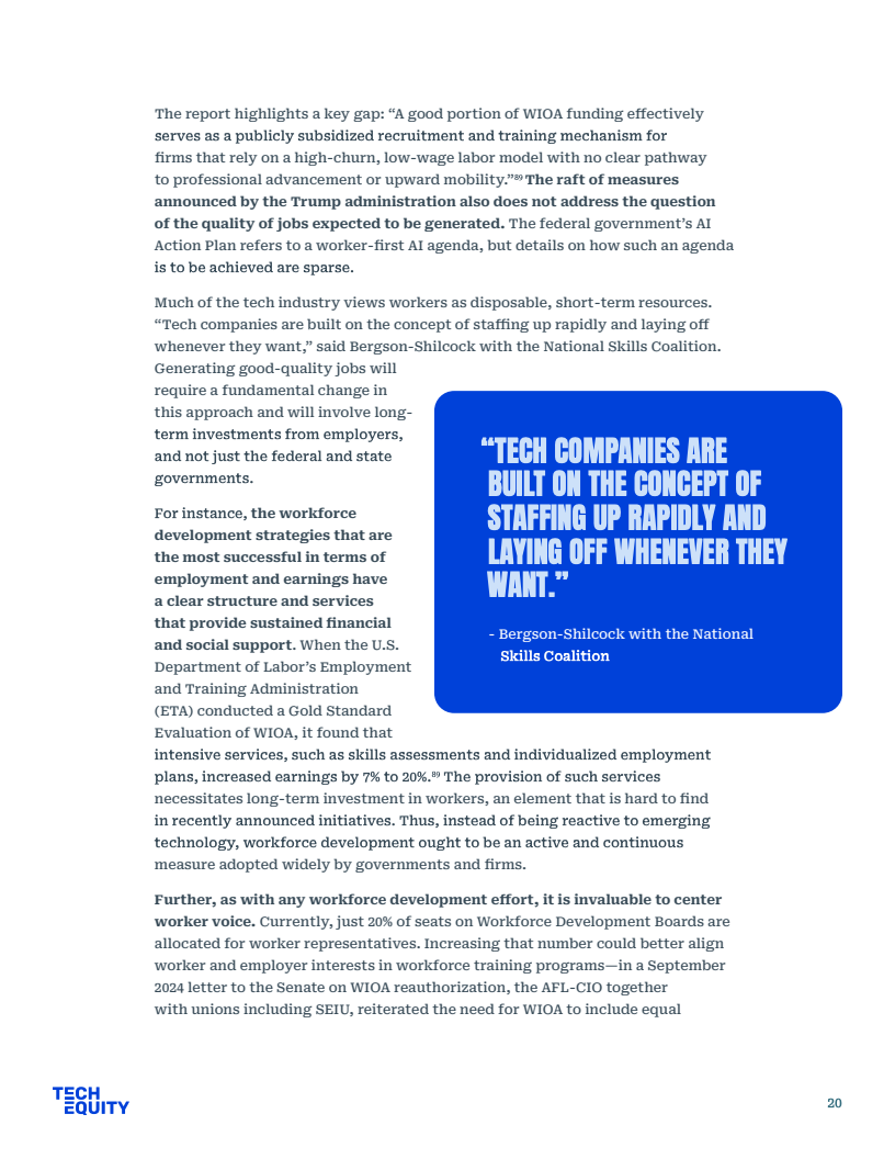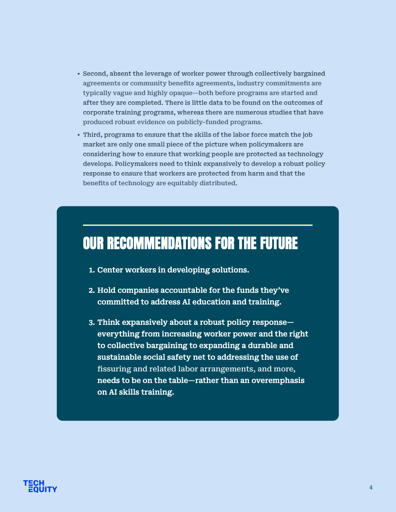 公共政策方面,劳工部虽宣布3000万美元拨款,但核心法案WIOA仍面临4亿至10亿美元的资金缺口,难以支撑长期的经济流动性。相比之下,工会主导的集体谈判更具实效,如WGA与SAG-AFTRA成功确立了AI使用同意权与赔偿机制,有效平衡了劳资关系。唯有建立严格的企业问责制与社区福利协议,才能确保巨额培训资金真正转化为劳动者的技能资产。