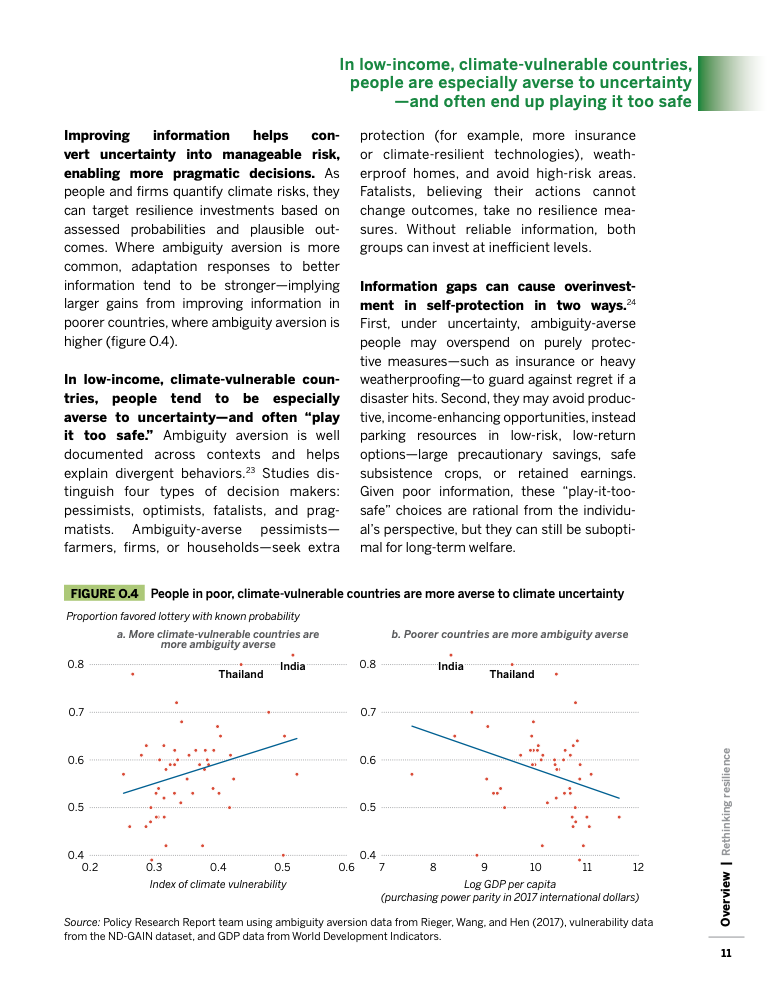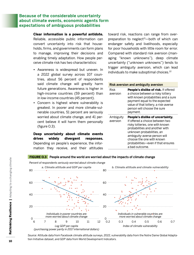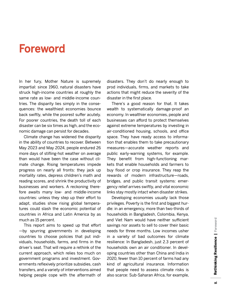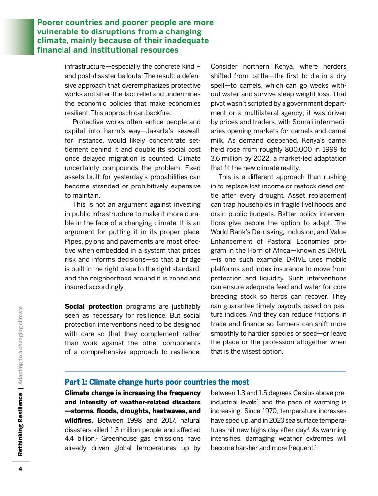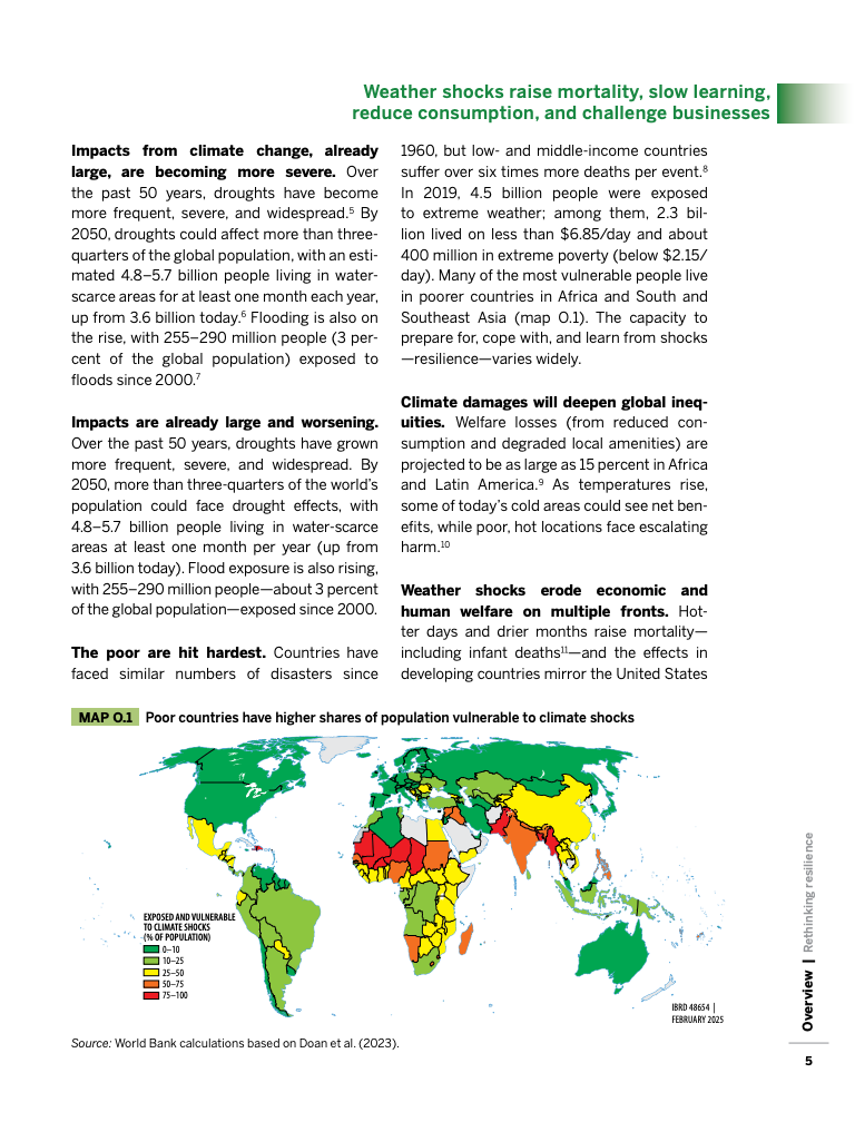 全球气候变暖已使灾害频率和强度显著上升,过去二十年间,洪水已影响2.55至2.9亿人,而自1960年以来,低收入和中等收入国家每次灾害的死亡率是高收入经济体的六倍以上。这些数字表明,发展中经济体脆弱性不仅源于更严酷的气候,还源于收入、基础设施与风险管理体系的长期不足。