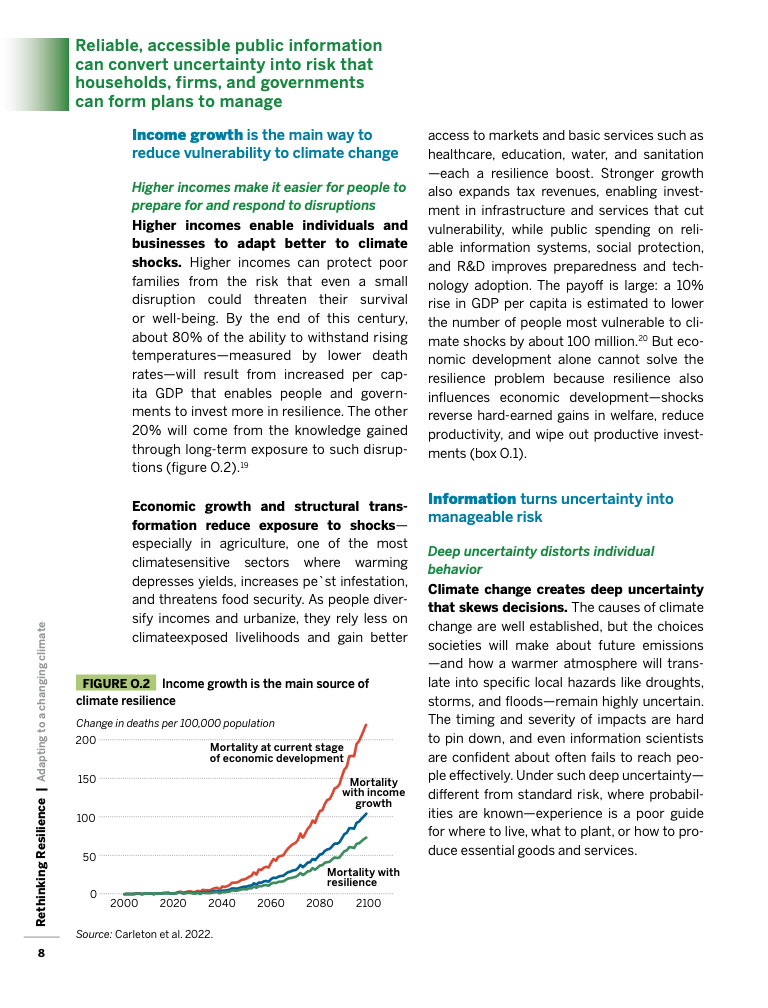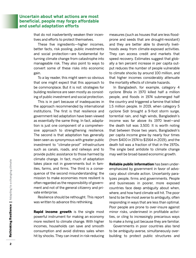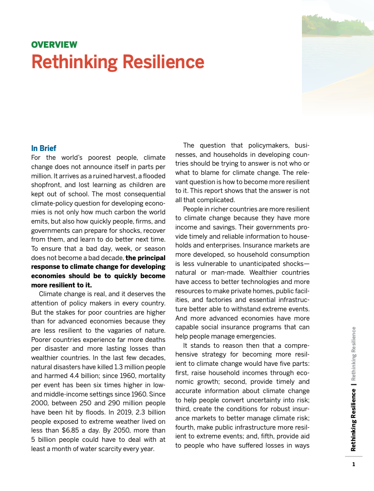 报告显示,收入是决定韧性最核心的因素。全球范围看,人均GDP每提高10%,可减少约1亿名最易受气候冲击影响的人口。以孟加拉国为例,1970年博拉飓风造成50万人死亡,而2019年锡德尔飓风虽等级更高,死亡人数却降至3500人,其间人均收入增长近四倍,反映出经济发展在降低灾害死亡率方面的关键作用。