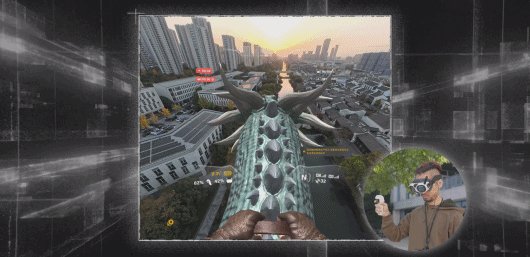 而且他们不只是单纯在画面上加了个龙头的贴图,只要你转转头,就能看到龙的身子和正在扇动的翅膀,回头甚至还能看见尾巴,他们真的做了一整条龙的动画建模出来,虽然不是很高清吧,但情绪价值绝对拉满了,驯龙高手不再是梦想。