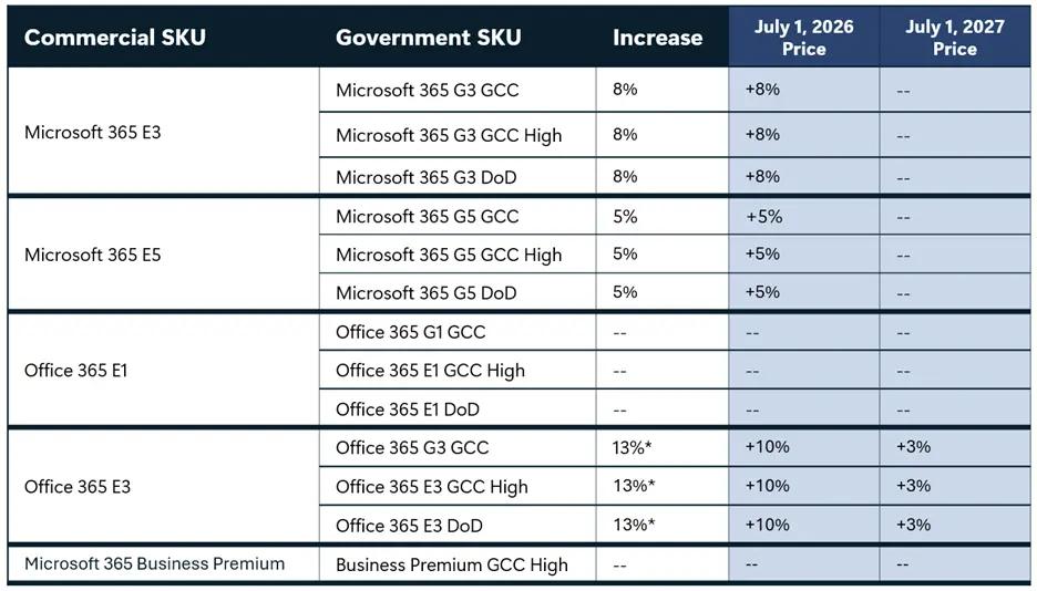 微软表示:实际价格将根据本地市场调整,非营利组织定价与商业价格同步变更。政府版套件调整如下: