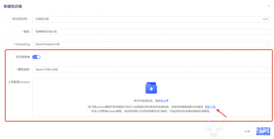第一步:构建基于图检索增强的知识库。在新建知识库时开启知识图谱选项,选择实体关系抽取模型,下载、设置和导入图谱schema模板。